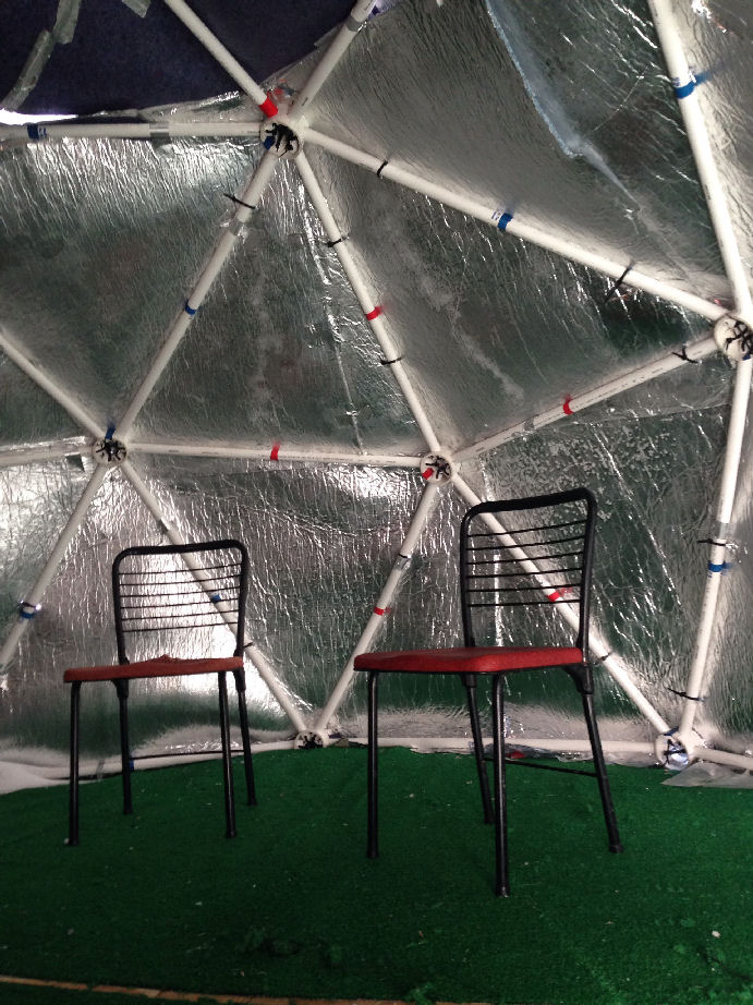 Here is a picture of our dome on a frozen lake. We built a greenhouse onto the front of it and constructed a shell made from a layer of recycled denim insulation and Tyvek. The dome was easy to assemble and we were really pleased with it.